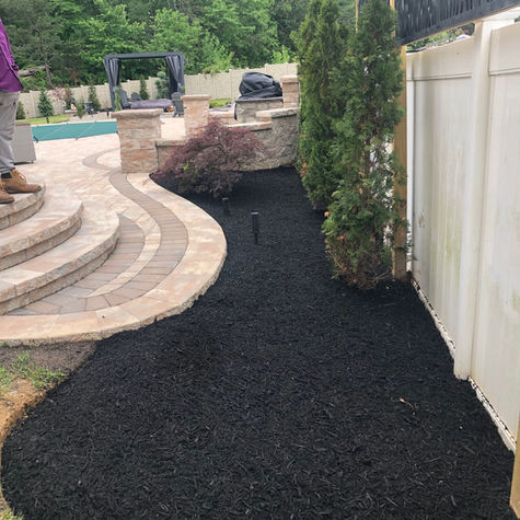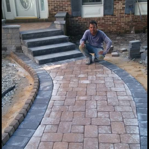A collection of images showcasing stone retaining walls, a house with a porch, and a beautifully landscaped garden with a stone pathway and flowers.